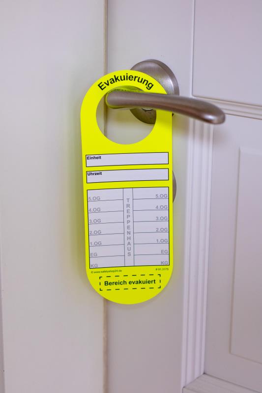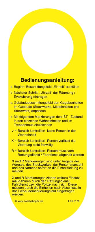 Türanhänger zur Markierung von Gebäuden, Objekten etc. als Hilfsmittel für Feuerwehr, Polizei, Katastrophenschutz etc.Lochgröße: 50mmRobust und reißfest!Material: Kunststoff ca. 0,5mm, mattGröße: 20,50 x 7,50 cm2-seitig (Vorder- und Rückseite unterschiedlich) 1/1-farbig bedruckt im Kombi-Druckverfahren > Grundfarbe: ca. RAL 1026 (Leuchtgelb / Tagesleuchtfarbe), Druckfarbe: schwarz und grau 30%