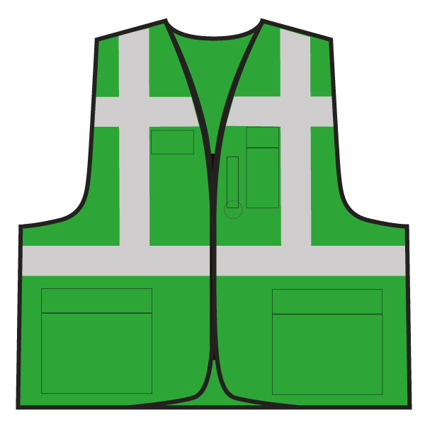 MultifunktionswesteInkl. individuellem RückenaufdruckZwei 5 cm breite Reflexstreifen um den Körper und Schulter.Reißverschluss2 Taschen mit Klettverschluss-Klappenin Brusthöhe: Ausweistasche, kleine Tasche, Stifthalter, SchlüsselringFarbe: grün