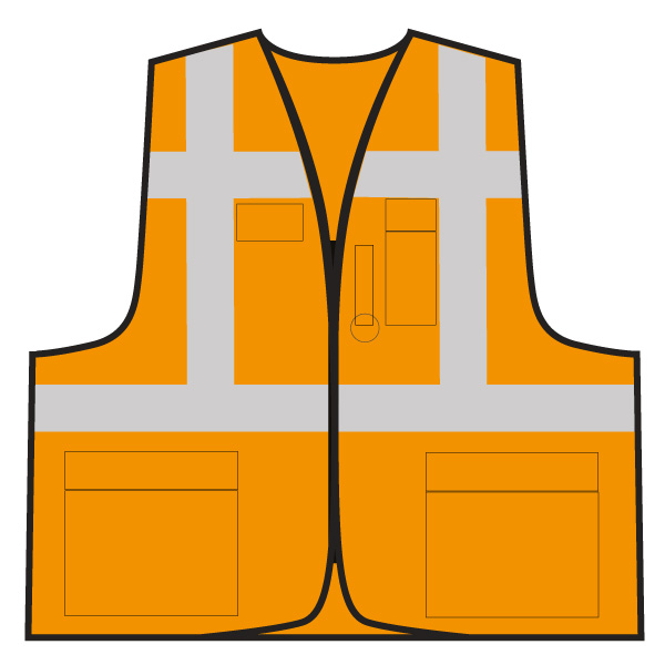 MultifunktionswesteInkl. individuellem RückenaufdruckZwei 5 cm breite Reflexstreifen um den Körper und Schulter.Reißverschluss2 Taschen mit Klettverschluss-Klappenin Brusthöhe: Ausweistasche, kleine Tasche, Stifthalter, SchlüsselringFarbe: orange