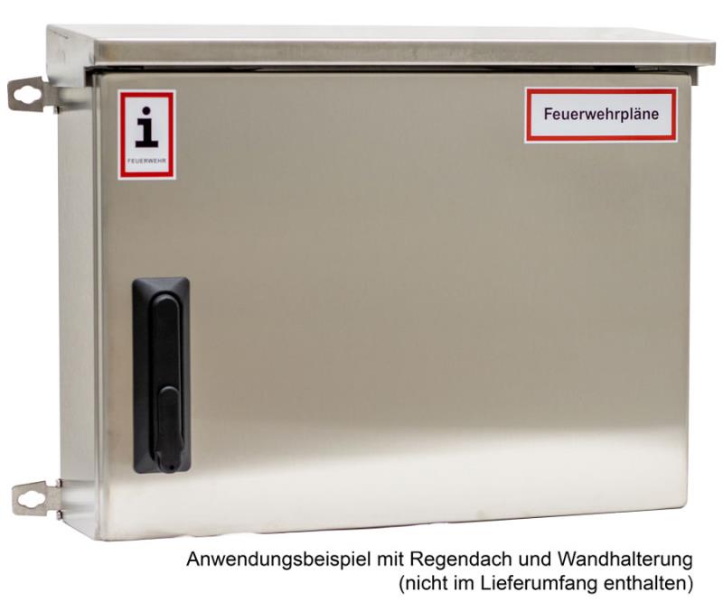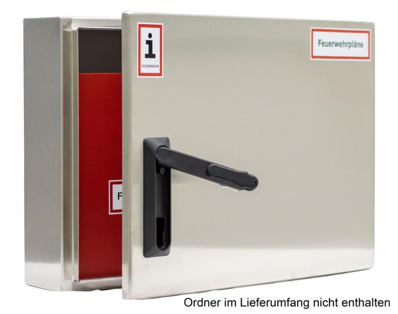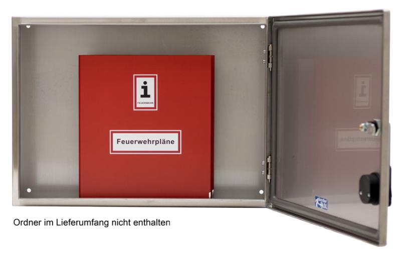 Vorderseite mit Aufkleber "Feuerwehrpläne" und "Information für die Feuerwehr" nach DIN 4066. Material: Edelstahl, Schutzart: IP 65, mit Druckausgleichsstopfen, für Wandmontage. Schließung: Aufnahme für Profilhalbzylinder nach DIN (Baulänge 30/10).Kapazität: 2 Ordner DIN A3, Rückenbreite 50,00 mm oder 2 Ordner DIN A3, Rückenbreite 80,00 mm zu 70% gefüllt