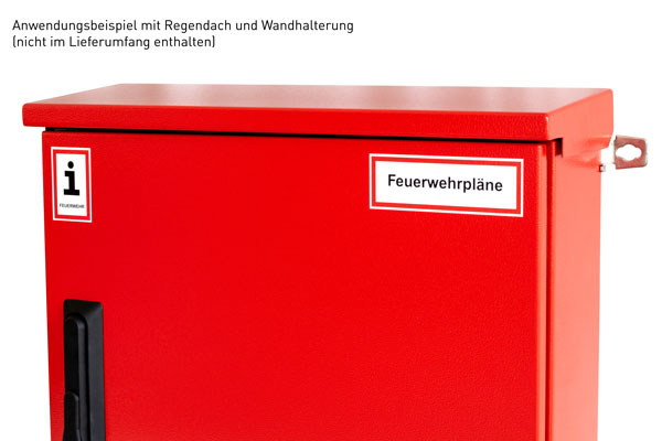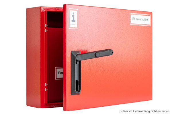 Vorderseite mit Aufkleber "Feuerwehrpläne" und "Information für die Feuerwehr" nach DIN 4066. Material: Stahl, Farbe: RAL 3000, Schutzart: IP 65, mit Druckausgleichsstopfen, für Wandmontage. Schließung: Aufnahme für Profilhalbzylinder nach DIN (Baulänge 30/10).Kapazität: 2 Ordner DIN A3, Rückenbreite 50,00 mm oder 2 Ordner DIN A3, Rückenbreite 80,00 mm zu 70% gefüllt