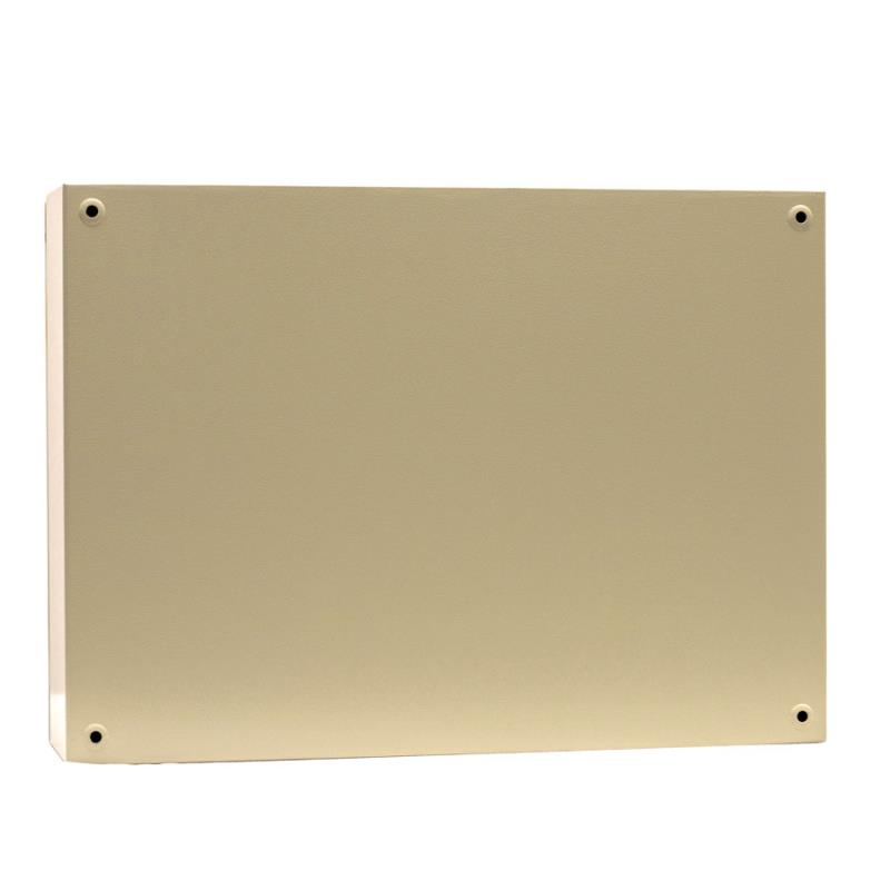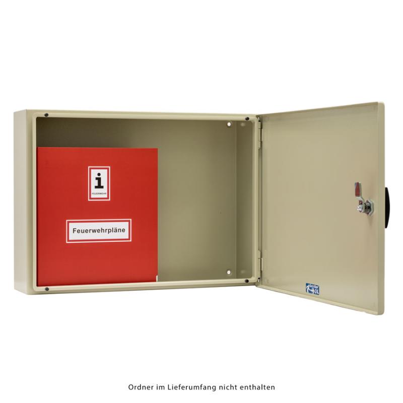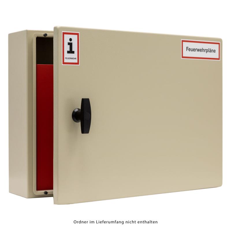 Vorderseite mit Aufkleber "Feuerwehrpläne" und "Information für die Feuerwehr" nach DIN 4066. Material: Stahl, Farbe: RAL 7035, für Indoor-Wandmontage. Schließung: DrehgriffKapazität: 2 Ordner DIN A3, Rückenbreite 50,00 mm oder 2 Ordner DIN A3, Rückenbreite 80,00 mm zu 70% gefüllt