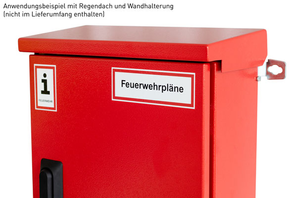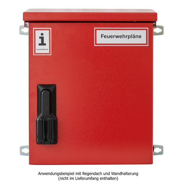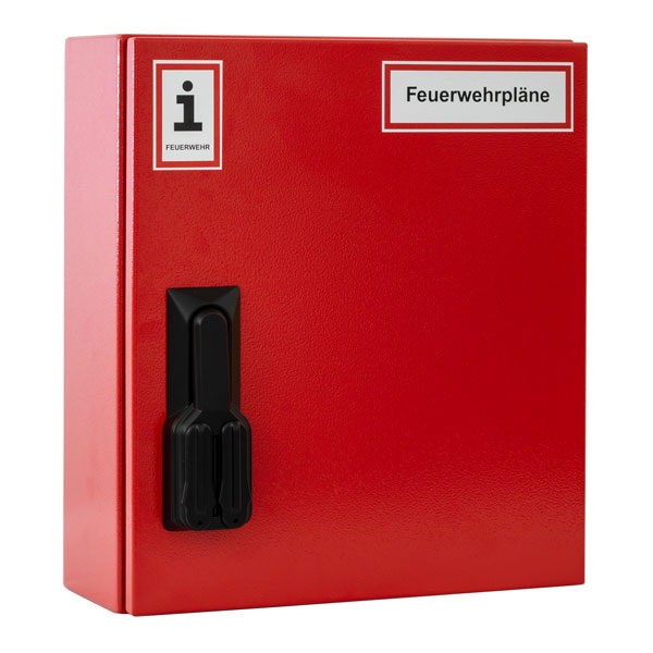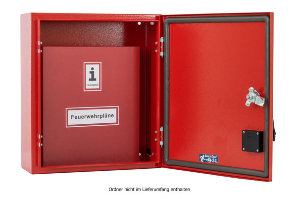 Vorderseite mit Aufkleber "Feuerwehrpläne" und "Information für die Feuerwehr" nach DIN 4066. Material: Stahl, Farbe: RAL 3000, Schutzart: IP 65, mit Druckausgleichsstopfen, für Wandmontage. Schließung: Doppelzylinder-Schwenkhebel mit Aufnahme für Profilhalbzylinder nach DIN (Baulänge 30/10).Kapazität: 2 Ordner DIN A4, Rückenbreite 50,00 mm oder 2 Ordner DIN A4, Rückenbreite 80,00 mm zu 70% gefüllt
